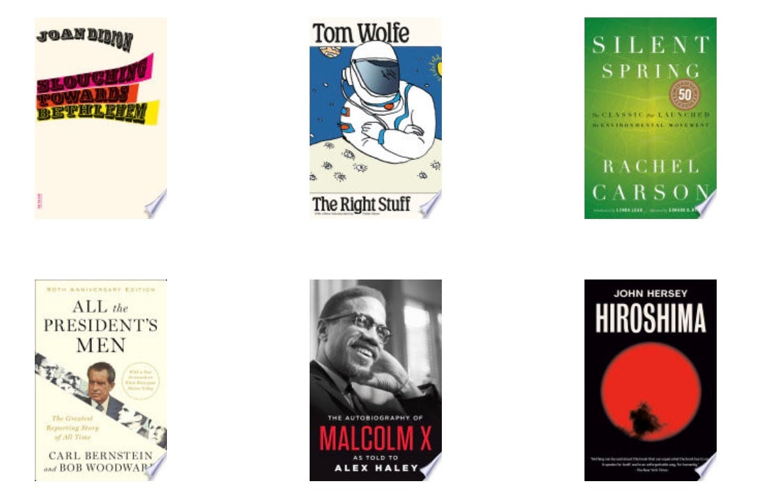 -Narrative nonfiction: Here are just some of the books, articles, and narrative audio pieces I wish I’d been assigned back in the aughts, with instruction not just on their themes, but their writing and storytelling techniques: “The Falling Man,” Slouching Towards Bethlehem, Hiroshima, All the President’s Men, The Right Stuff, Silent Spring, “The House on Loon Lake,” and The Autobiography of Malcolm X. And if I were to add works published after I graduated high school, I’d throw in: Behind the Beautiful Forevers, The Immortal Life of Henrietta Lacks, “The Living Room,” and The Lost City of Z.
